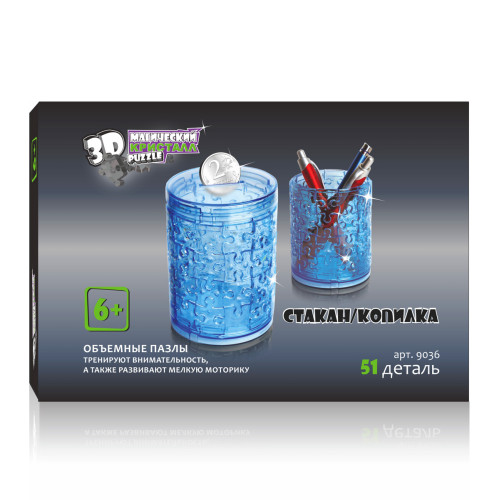 Развивающие 3D головоломки или 3D пазлы - пазлы нового поколения, разместив детали в нужном порядке, вы получите трехмерную фигурку 3D Crystal Puzzle Стакан для карандаша 9036, которая сможет стать яркой игрушкой для вашего ребенка или роскошным украшением любой комнаты. Объемные 3D crystal puzzle подойдут как детям, так и взрослым. Вы получите не только массу удовольствия, собирая кристаллические фигуры, но и проведете время с пользой. По мнению психологов, собирание пазлов способствует развитию образного и логического мышления, произвольного внимания, восприятия, в частности, различению отдельных элементов по цвету, форме, размеру и так далее; учит правильно воспринимать связь между частью и целым; развивает мелкую моторику. ВНИМАНИЕ: данный товар является головоломкой, а не конструктором! Поэтому наличие подробной инструкции в наборе не предполагается.